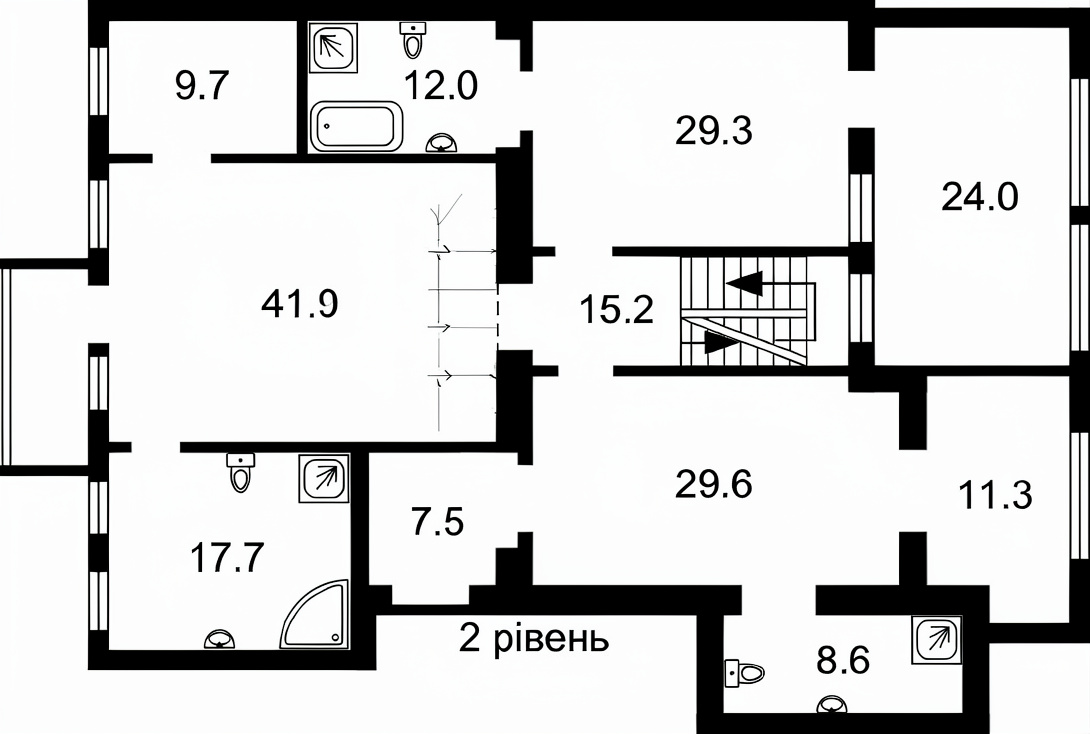 Spanning an impressive 402 m² across two levels, this residence represents a rare opportunity in Kyiv’s real estate market. The property has been structurally prepared for a high-end renovation: new electrical wiring, fully replaced plumbing, reinforced inter-floor metal beams with fresh screed, and walls finished in plasterboard. This creates a clean architectural base ready for a fully bespoke interior concept.