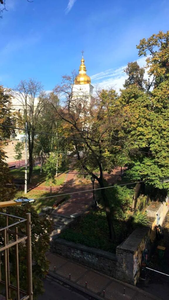 One of the apartment’s most remarkable features is the view of St. Michael’s Golden-Domed Monastery, one of the city’s most iconic landmarks. The building itself offers a well-maintained entrance and a quiet, closed courtyard with free parking spaces, an uncommon advantage in the historic city center.