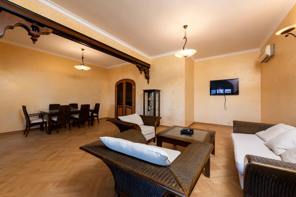 The apartment offers 119 m² of well-balanced space, including two separate rooms and a spacious bathroom. High-quality renovation has been completed using premium materials, including natural oak parquet flooring. Situated on the 8th floor of a 9-storey building, it enjoys elevated city views and excellent natural light.